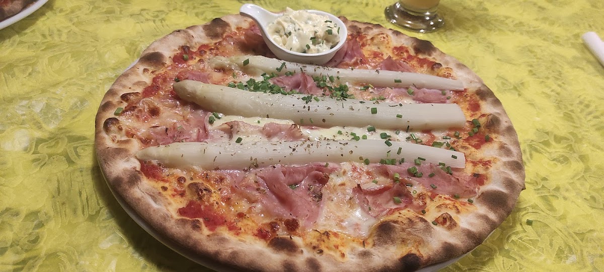 Da decenni la pizza a mio gusto, piu leggera con pasta sottile oltretutto molto buona. La buongustaia servita con vaschetta a parte di Boznersose. Salsa bolzanina tipica per gli asparagi.